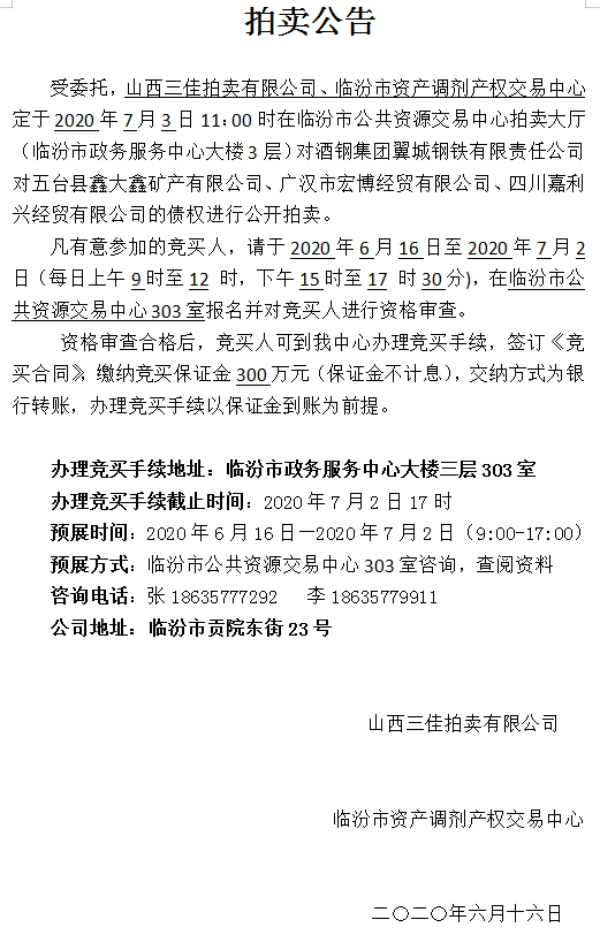酒钢翼城钢铁公司债权拍卖公告