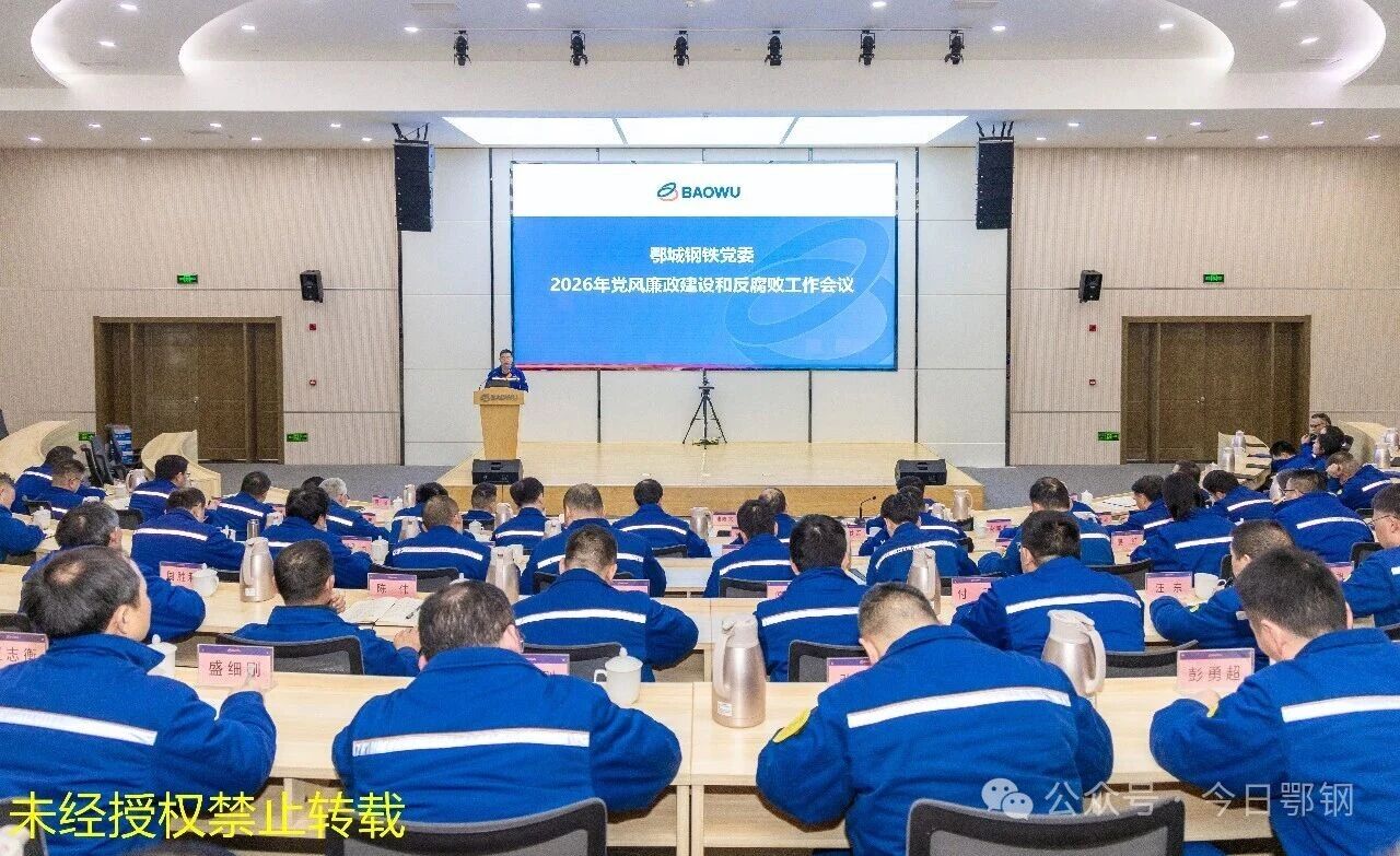 1月26日上午,在参加完中国宝武和中南钢铁2026年党风廉政建设和反腐败工作视频会议后,鄂城钢铁公司党委及时召开党风廉政建设和反腐败工作会,以习近平新时代中国特色社会主义思想为指导,传达学习党的二十大、二十届历次全会和二十届中央纪委五次全会精神及中国宝武、中南钢铁党风廉政建设和反腐败工作会议精神,全面贯彻落实习近平总书记关于“三个更加”重要要求、二十届中央纪委五次全会精神和中国宝武、中南钢铁党风廉政建设和反腐败工作部署要求,总结部署鄂钢党风廉政建设和反腐败工作。
