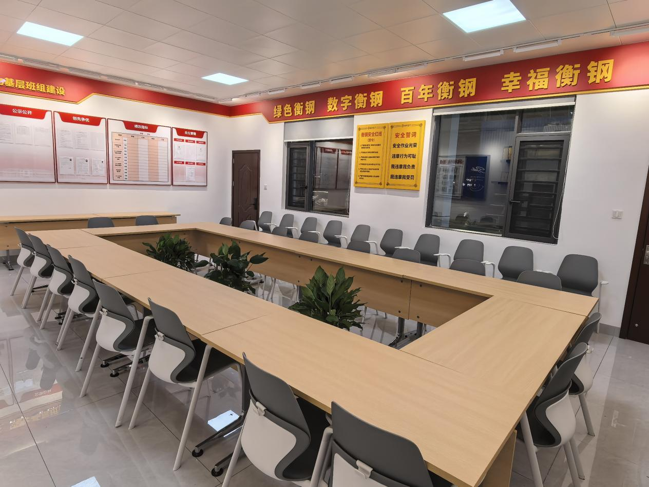 顶层设计,打造“1+3”体系下的“幸福细胞”。2025年下半年,衡钢着力健全三级管理体系,强化基层班组建设。进入2026年,衡钢党委全力构建“1+3”党建管理体系,明确提出党建工作既要抓好基础基层工作,更要引导基层党组织抓好“产品、工作、队伍”三大品质,实现“环境、人文、生活”三大幸福,最终促进个人、企业、社会的协同发展。在此背景下,为充分发挥党支部战斗堡垒作用,搭建班组学习交流平台,衡钢启动班组阵地标准化建设工作,要求二级厂分别为各车间及相应的党支部量身打造功能完备、风格一致的交接班会议室,为基层注入“幸福动能”。