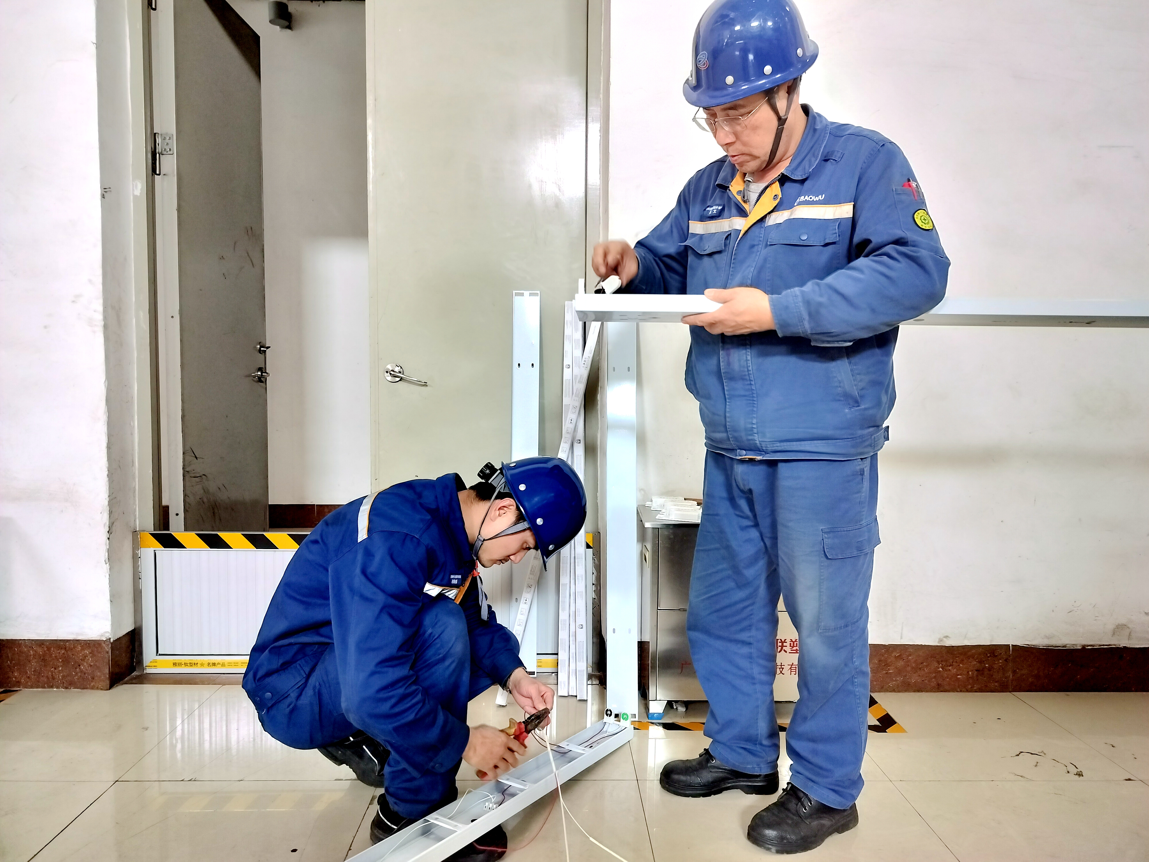 方案确定后,大家立即行动。领用灯座、灯管,结合GIS室空间高大特点,每个灯座安装两根LED灯管。作业人员做好安全措施,两人一组配合:提前预留并固定电线,登高拆除原有射灯线路,绝缘包扎后整理入旧灯具内,再固定LED灯座、接线、装盖、卡装灯管。送电后,LED灯即开即亮,明亮又便捷。