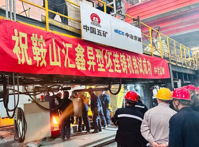 由中冶京诚设计供货,具有完全自主知识产权的国内首台兼容板坯、矩形坯、异形坯复合型连铸机,于2023年3月10日9时58分在辽宁紫竹集团鞍山汇鑫铸业有限公司首次开浇异型坯,10时58分顺利脱引锭,热试断面:500×470×180mm,生产钢种为Q235B,设备运转正常,浇铸过程稳定,热试圆满成功。该连铸机最大重型异型坯断面预留1300x520x140mm,为世界最大断面。