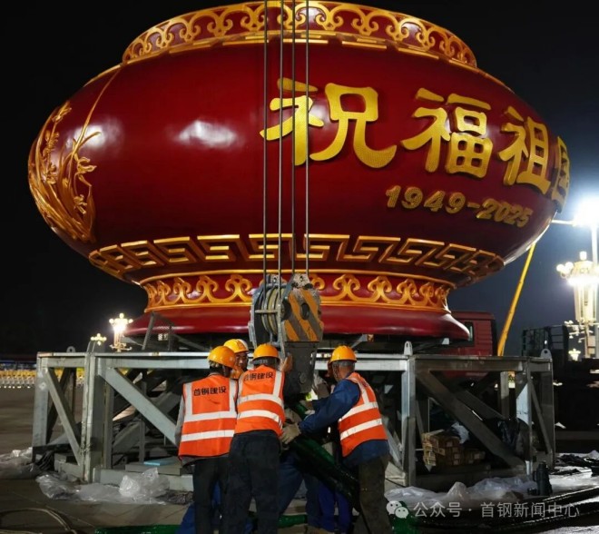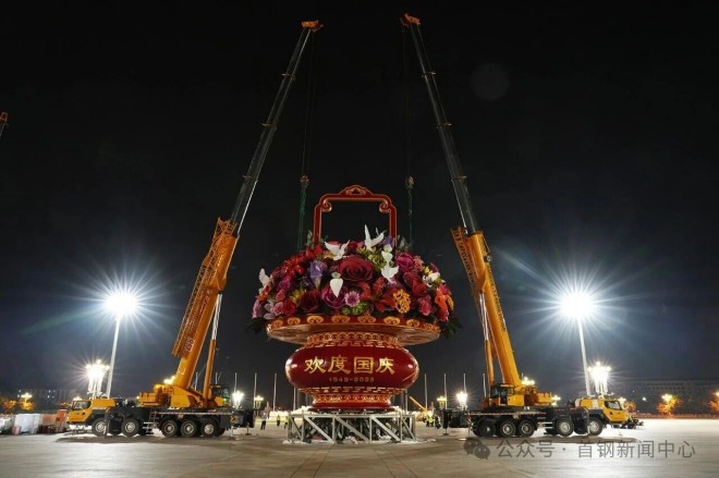 天安门巨型花篮钢结构总量245吨,采用装配式钢结构,工程最大难度在于篮盘与篮肚通过吊装完美合龙。插好花的篮盘重约60吨,需要两台吊车同时协作完成。为确保白天游客游览体验,大型吊装设备需在天亮前撤离,主要吊装工作集中在夜间,对经验和技术提出了极大考验。施工期间,为严格把控工程进度,首钢建设将每一项安装环节的时间节点细化到分钟,保证整体施工顺利推进、按期完工,为国庆增添喜庆氛围。