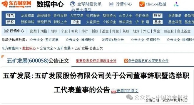 10月10日,五矿发展发布公告,五矿发展股份有限公司董事会于近日收到董事鲁辉先生提交的辞职报告,由于公司工作安排原因,鲁辉先生申请辞去公司第十届董事会董事、董事会提名委员会委员职务。 根据相关规定,鲁辉先生的辞职报告自送达公司董事会时生效。