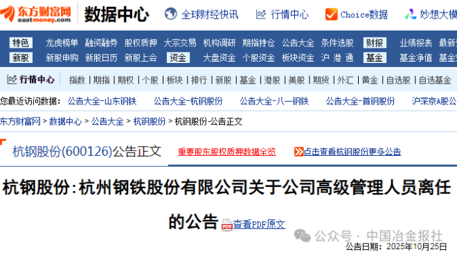 10月25日,杭钢股份发布了关于公司高级管理人员离任的公告。
