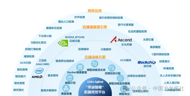 在此背景下,中冶京诚数字科技(北京)有限公司(以下简称“中冶京诚数科公司”)依托多年在工业现场的深度实践与技术沉淀,历经多个典型应用场景的迭代优化,成功将实践经验转化为核心技术能力,全新升级推出“京诚智瞳”机器视觉产品。该产品以自主研发AI中台为底座,集AI模型开发、模型训练与边缘AI视觉终端于一体,不仅为企业数字化转型注入强劲动力,更以“AI+视觉”的创新模式,为“十五五”规划中智能制造目标的实现提供了可落地、可复制的解决方案,为构筑工业智能时代的视觉中枢奠定坚实基础。