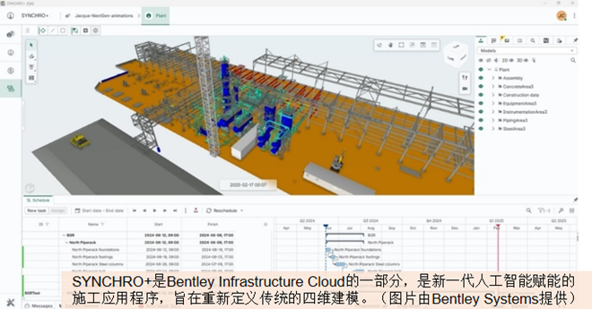 施工管理:SYNCHRO+是Bentley Infrastructure Cloud的一部分,是由人工智能赋能的下一代施工应用程序,它重新定义传统的四维建模。通过采用以数据为中心的工作流,SYNCHRO+简化了施工规划和协作。它集成了可提供丰富地理空间环境信息的Cesium,并利用人工智能以更高的深度、更快的速度和更切实可行的洞察探索施工顺序。SYNCHRO+将于2025年12月推出早期试用版本。