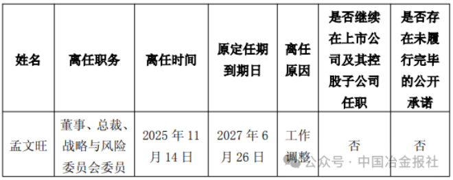 《公告》显示,重庆钢铁股份有限公司董事会于2025年11月 14日收到孟文旺先生的辞职报告,因工作调整,孟文旺先生辞去公司董事、总裁、董事会战略与风险委员会委员职务。离任后,孟文旺先生不再担任公司任何职务。