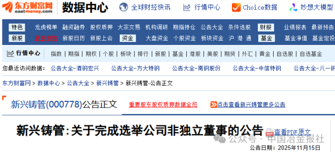 11月15日,新兴铸管发布《关于完成选举公司非独立董事的公告》(以下简称《公告》)。