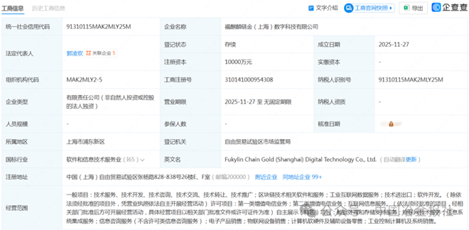据企查查网站信息,2025年11月27日,福麒麟链金(上海)数字科技有限公司成立,法定代表人为郭凌欢,由福建省三钢(集团)有限责任公司全资持股。该公司注册资本10000万元,注册地为上海市浦东新区。