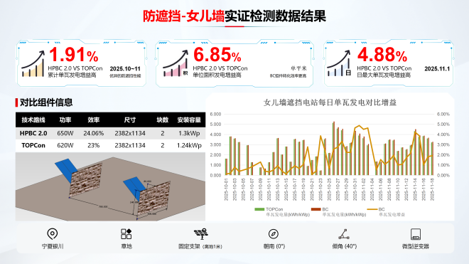 实证数据显示,从10月初到11月中旬,三防组件对比TOPCon累计单瓦发电增益高出1.91%,单位面积发电增益高出6.85%。这说明,三防组件在面对“横向带状”遮挡时具备更大发电优势。这一优势也直接转化为经济效益——1MW电站BC组件较TOPCon一年少损失发电收益1.183万元。