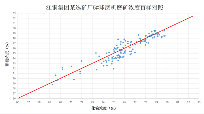 目前,产品已成功落地江铜集团某选矿厂、首钢集团某选矿厂等行业标杆企业。在江铜选矿厂的长期运行数据跟踪中,通过采集117组盲样进行误差分析显示:样本覆盖浓度范围的化验区间为69.25%~79.8%,预测区间为68.77%~79.54%,盲样总体标准偏差达1.51%,在线预测值与化验值相关性良好(R^2=0.83)。江铜集团某冶炼厂、晋南矿业某选矿厂等合作项目也在稳步推进,未来将为更多企业的磨矿工艺升级提供技术支撑。