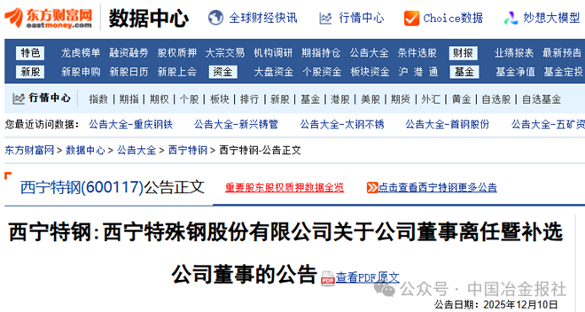 12月10日,西宁特钢发布《西宁特殊钢股份有限公司关于公司董事离任暨补选公司董事的公告》(以下简称《公告》)。