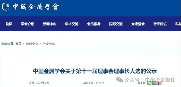 12月23日,中国金属学会官网发布了关于第十一届理事会理事长人选的公示(以下简称“公示”)。