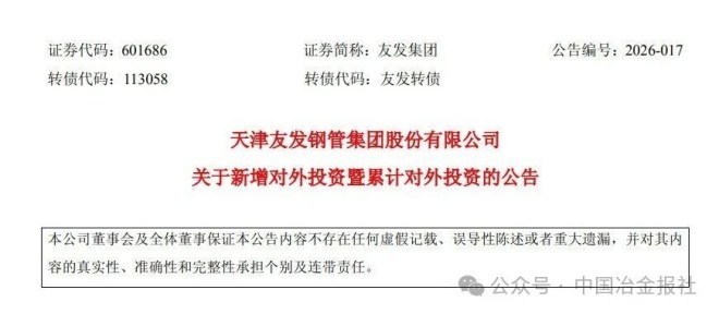 2月4日,天津友发钢管集团股份有限公司(以下简称公司或友发集团)发布《关于新增对外投资暨累计对外投资的公告》。