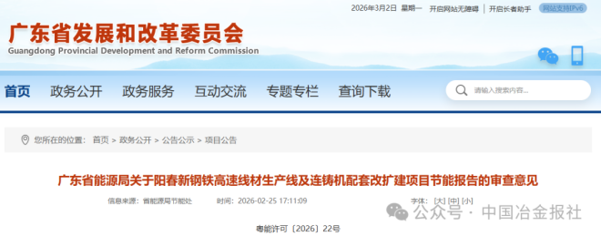 2月25日,广东省能源局发布关于阳春新钢铁高速线材生产线及连铸机配套改扩建项目节能报告的审查意见。