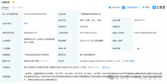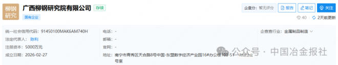 企查查显示,近日,广西柳钢研究院有限公司成立。