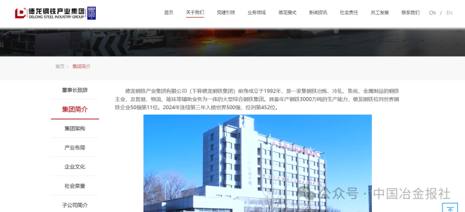 德龙钢铁产业集团有限公司(以下简称德龙钢铁集团)前身成立于1992年,是一家集钢铁冶炼、冷轧、焦化、金属制品的钢铁主业,及贸易、物流、能环等辅助业务于一体的大型综合钢铁集团。具备年产钢铁3000万吨的生产能力,德龙钢铁集团位列世界钢铁企业50强第11位。2024年连续第三年入榜世界500强,位列第452位。