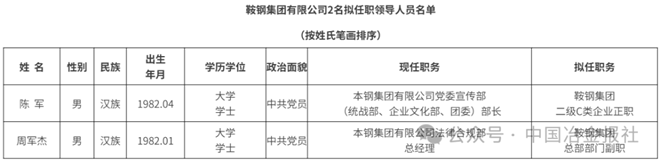 其中显示,经鞍钢集团有限公司党委研究决定,对2名拟任职领导人员面向全公司实施任前公示。具体如下: