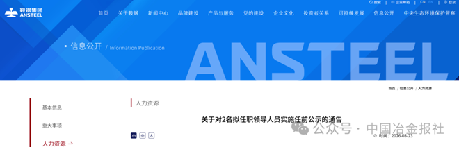 近日,鞍钢集团官网发布《关于对2名拟任职领导人员实施任前公示的通告》。