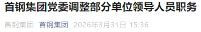 3月31日,首钢集团官微发布《首钢集团党委调整部分单位领导人员职务》一文。