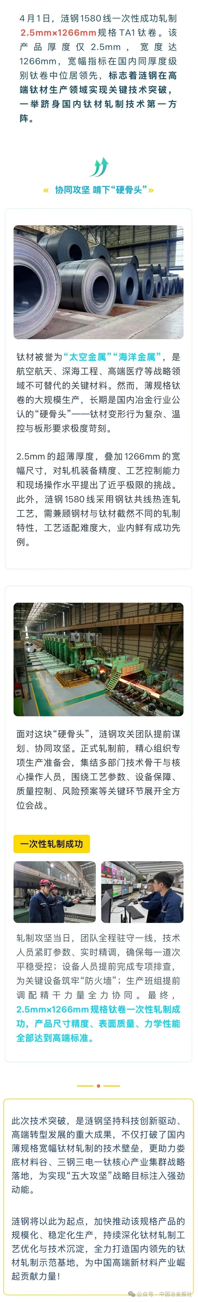 国内领先!涟钢成功轧制2.5mm×1266mm规格TA1钛卷