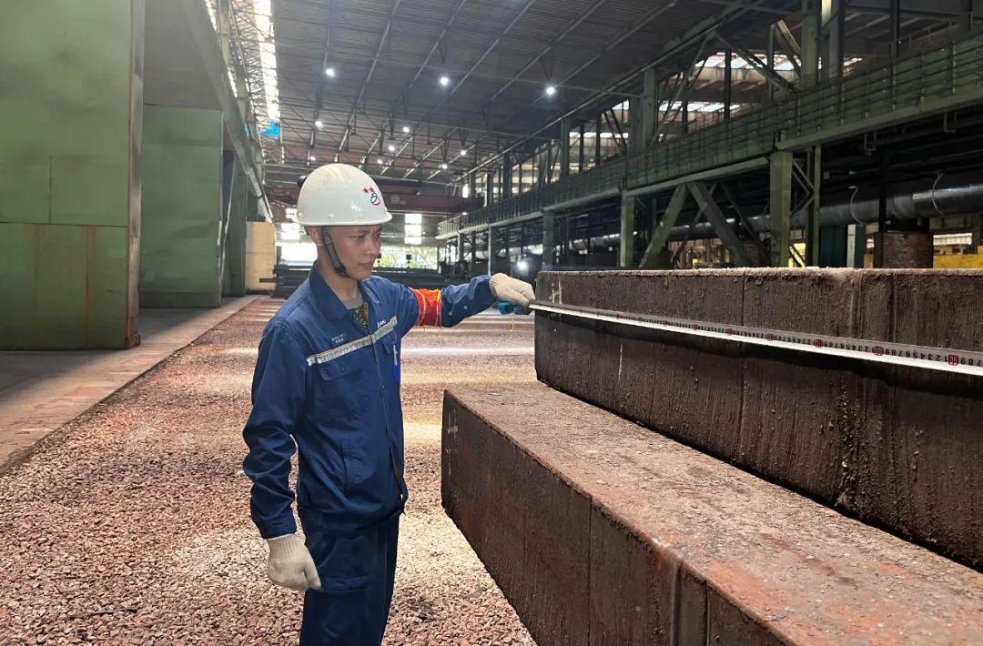 精打细算降成本,千方百计提效益。当班值班长以加热炉、轧机、精整剪切线产能匹配为前提,优化轧制计划编制,以钢板流通、产能稳定为原则同炼钢、轧钢生产计划紧密衔接;生产技术室技术人员通过提高轧制速度,匹配粗精轧轧制节奏,保证粗轧至精轧钢板尽量不待温,释放轧机力能,增大最大压下量,缩减轧制道次,一季度平均轧制节奏较2023年缩短9.64s/块、小时块数提高2.73块/小时,做到在断面变化单重减小的情况下,轧机小时产量稳定,精整线不堵板,提高了厚板产线的生产效率,准发成材率达到93.28%。其中,1月产量217267吨,打破了月产量历史纪录。
