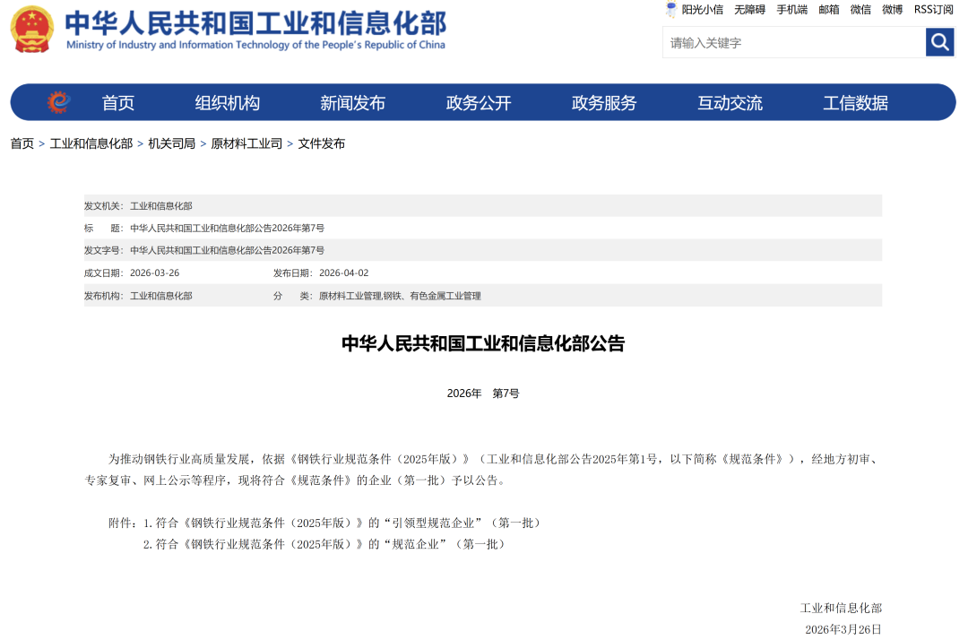 近日,工业和信息化部发布2026年第7号文件,正式公告符合《钢铁行业规范条件(2025 年版)》企业名单(第一批),重庆钢铁成功入选“规范企业”序列,成为西南地区钢铁行业高质量发展的标杆企业之一。