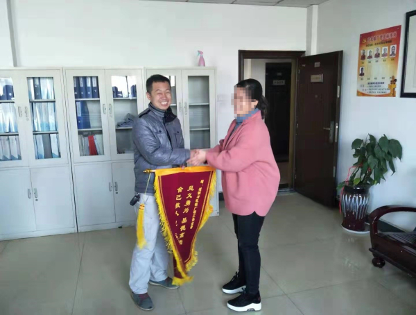 这是2020年1月8日上午9:30,在华菱涟钢冷轧板厂综合科办公室里笔者看到落水女青年刘某的母亲毛女士赠送锦旗给“救人英雄”关金普时的场景。