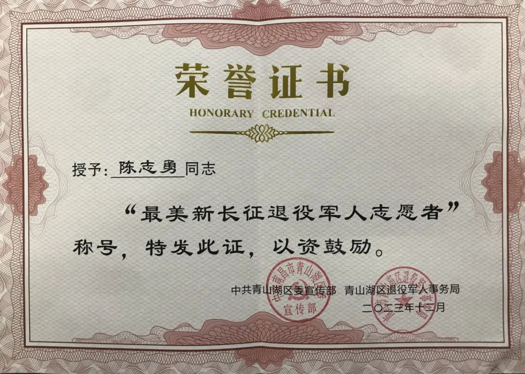 日前获悉,南昌市青山湖区召开2023年度退役军人“最美系列”表彰大会,全区最美退役军人、最美军嫂、尊崇之星、最美“新长征退役军人志愿者”和“最美退役军人集体”接受表彰。其中,辽宁方大集团旗下方大特钢员工陈志勇荣获“最美新长征退役军人志愿者”称号。