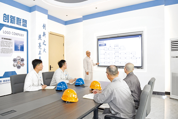 图为攻关团队成员讨论含酸废水处理工艺优化方案。