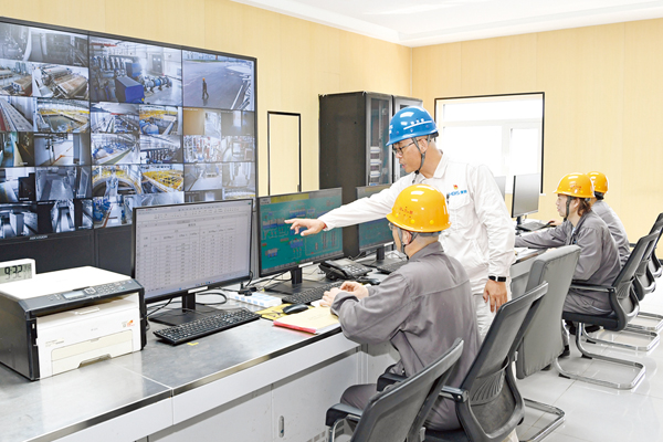 图为攻关团队成员在中控室分析工艺优化后的生产数据。
