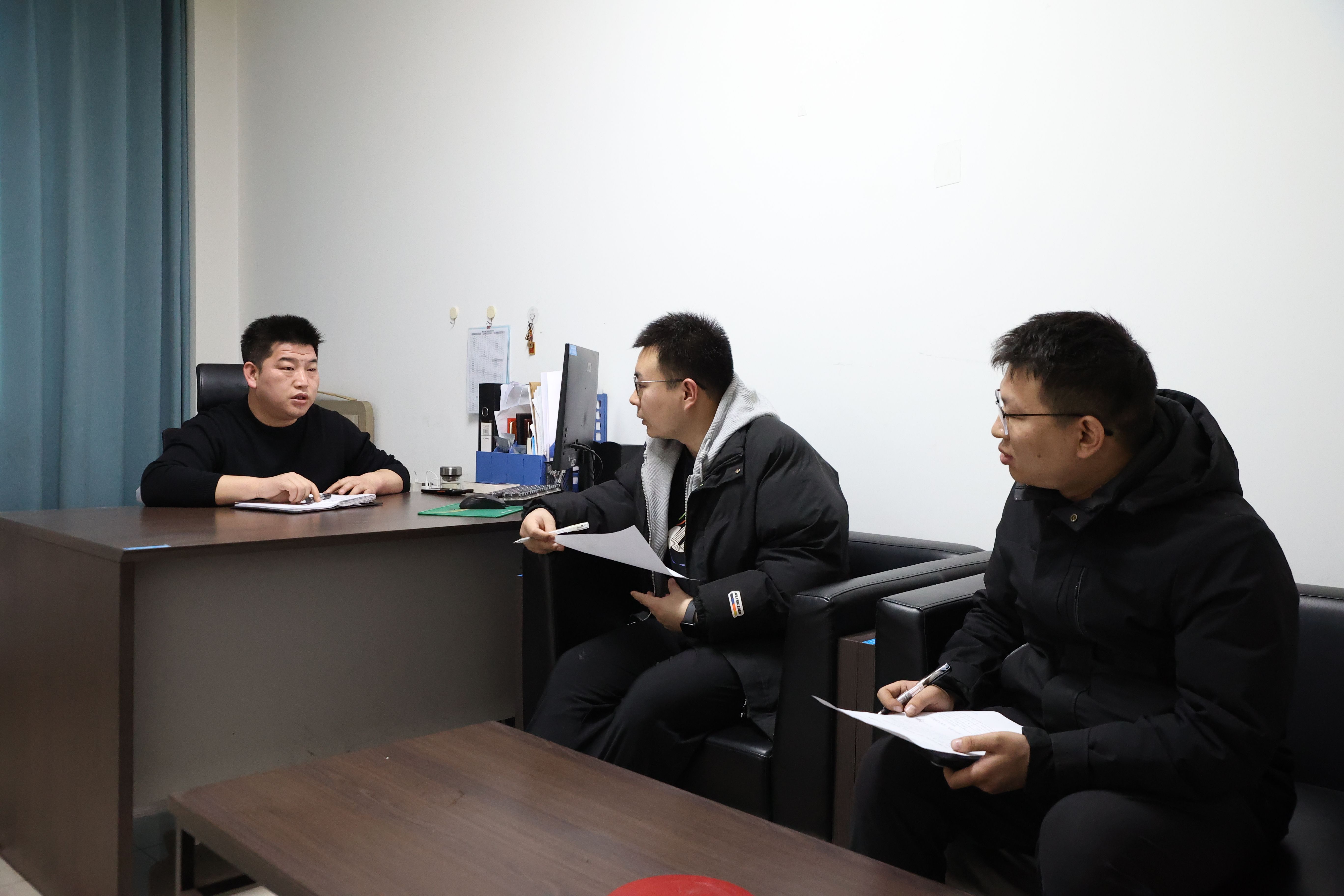 李朝阳(左一)正在和年轻职工谈心谈话,关心了解工作和生活情况