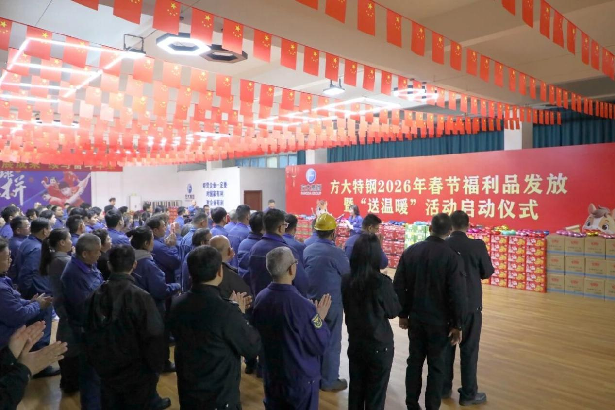 瑞蛇辞旧岁,骏马迎新春。值此农历马年春节即将来临之际,2月6日上午,方大特钢2026年春节福利品发放暨“送温暖”活动启动仪式在职工活动中心举行。该公司党委书记张楠,党委副书记、工会主席邓斌出席仪式,将企业的暖心关怀与新春美好祝福送到员工手中。