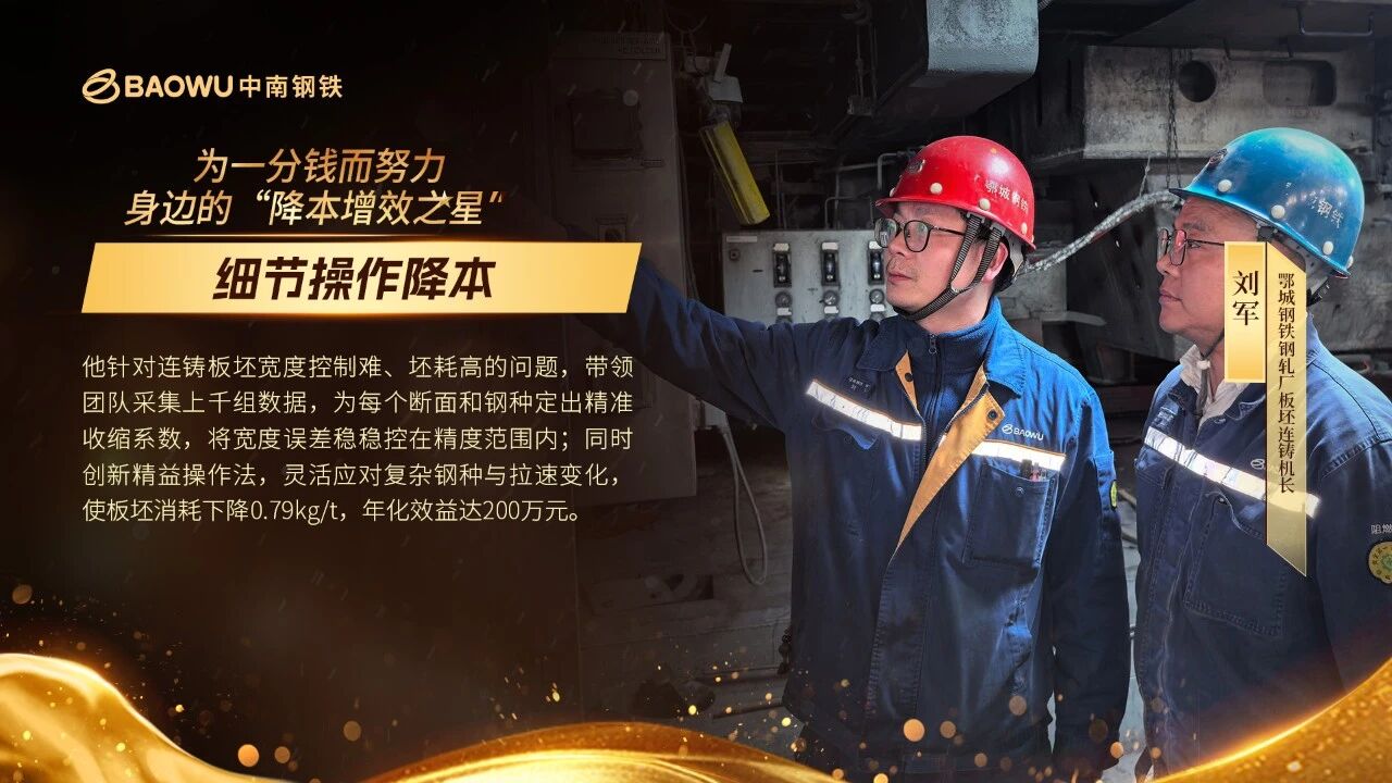 一句句叮嘱、一次次精准操作,刘军团队摸索的精益操作法落地见效,既稳住了生产节奏,又杜绝了短尺浪费。车间精益改善效果明显,板坯消耗一季度下降0.79kg/t,年化效益200万元。
