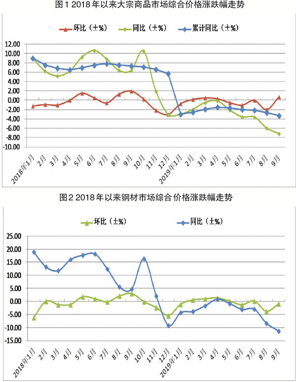 9月份,随着高温多雨季节结束,大宗商品市场迎来传统旺季,加之受宏观政策逆周期调节力度加大、基础设施建设加快推进等因素影响,大宗商品市场需求有所回暖。与此同时,在各地环保限产政策趋严、生产企业利润收窄的作用下,市场供应增速继续下滑。综合来看,9月份,大宗商品市场供需关系改善,整体运行向好,商品库存下降,市场价格止跌回升。