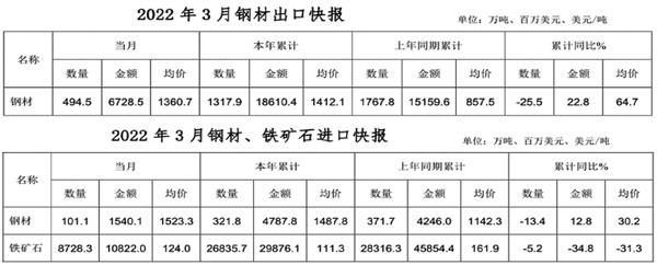 3月份,我国出口钢材494.5万吨,同比减少259.7万吨,下降34.4%;均价为1360.7美元/吨,同比上升522.7美元/吨,增长62.4%。1月~3月份,我国累计出口钢材1317.9万吨,同比减少449.9万吨,下降25.5%。