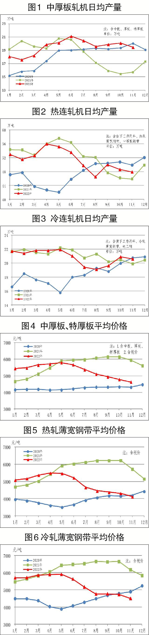2022年11月份,中厚板轧机、热连轧机和冷连轧机产量环比下降、同比上升。主要品种板中造船板、桥梁板、管线钢板和汽车板产量同比连续快速增长,集装箱板和家电板产量同比继续大幅下滑。