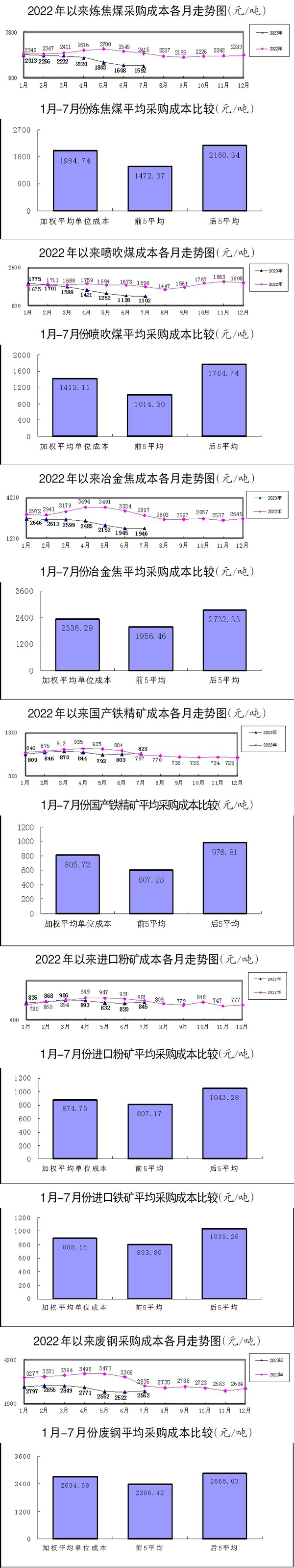 1月—7月份,炼焦煤采购成本同比下降20.02%;冶金焦同比下降26.17%;国产铁精矿同比下降5.97%,进口粉矿同比下降3.70%;废钢同比下降19.07%。