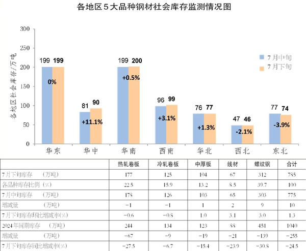 7月下旬,分地区来看,7大区域钢材社会库存环比各有升降,其中西北地区、东北地区的库存环比继续下降;华东地区的库存持平;其他地区均有所上升。其中,华中地区为增量和升幅最大地区,具体情况见下图。