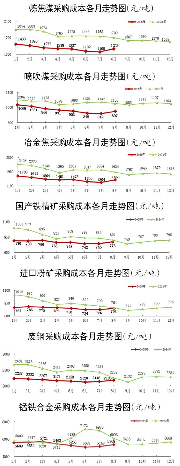 8月份,“对标挖潜”企业各品种采购成本均环比增长,煤焦主要品种增长10%以上,铁矿类品种增长3%以上。
