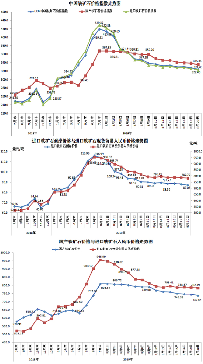 8月20日,中国铁矿石价格指数(CIOPI)324.46点,环比下降3.44点,降幅为1.05%。其中:国产铁矿石价格指数为335.35点,环比下降3.23点,降幅为0.95%;进口铁矿石价格指数为322.40点,环比下降3.48点,降幅为1.07%。