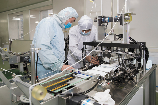 3月10日,福建三钢集团工作人员正在对援建福建省三明市的口罩生产线进行设备调试(如图)。针对三明市新冠肺炎疫情防疫物资紧缺的情况,三钢主动出资600余万元采购口罩生产设备和原料,援建5条口罩生产线。目前,4条生产线已投入生产。待5条生产线全部投产后,口罩日产量预计可达50万个。 (郑玉林 李文波 摄)