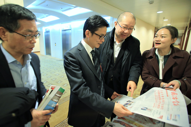 图为曹志强与陆闻言、熊余平、何惠平在京西宾馆湖南代表团驻地报刊取阅处阅览当日出版的《中国冶金报》。(本报两会报道组记者顾学超 摄)