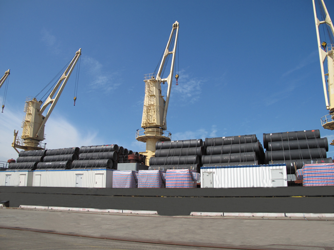 本钢北营铸管公司坚持品种创新、创效,“以特制胜、以特创效、以特促销”的战略,截至10月份,该公司新开发的“T”型接口DN2400、DN2600管,内自锚DN900、DN1800管处于铸管行业领先水平,新特品种销量比去年同期提高了10%,取得了较好的经济效益。图为在港口已经装船待发的“本钢牌”铸管。(记者 钱振德 实习记者 那丽 摄)