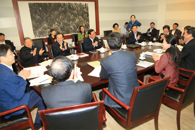 3月8日,《中国冶金报》记者来到江苏代表团第一组的讨论现场,采访来自钢铁行业的全国人大代表何达平(左二)。刚一进门,就听到一位代表的提议:“今天是三八妇女节。我们应该向还在工作的女代表、女记者致以节日的问候。”讨论组全体代表立刻响应,一齐向在场的女代表和女记者们鼓掌致意。
