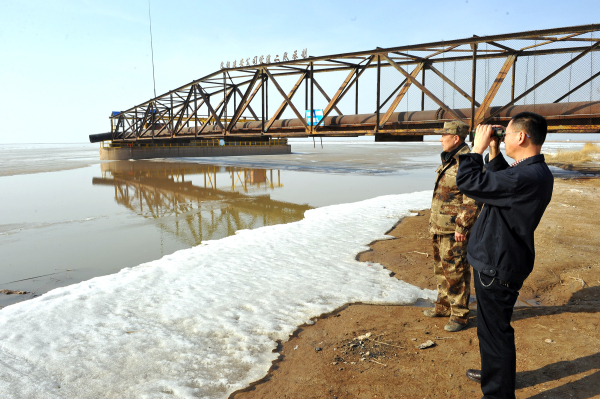 3月份,随着天气逐渐变暖,黄河内蒙古段已经开河。《中国冶金报》记者在包头钢铁集团水源地了解到,为了保证取水口段黄河安全度过凌汛,包钢民兵队伍和给水厂供水车间制定24小时值班制度,密切监视冰凌变化,为公司安全生产保驾护航。图为该公司值班民兵和供水车间职工正在巡视黄河凌情。(实习记者白立新 摄)