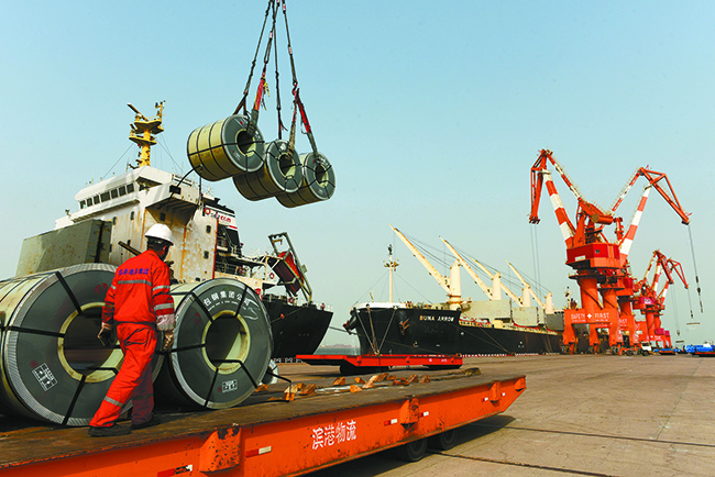 今年初以来,包钢在稳固原有海外市场的同时,积极开发新市场,深挖“一带一路”国家客户,产品出口再创佳绩。1月~4月份,包钢出口钢材64.92万吨,同比增长7.62%;出口额为4.13亿美元,同比增长31.31%;出口至47个国家,其中涉及“一带一路”沿线国家41个,出口量为61.19万吨。图为包钢出口韩国的镀锌卷正在天津临港装船外运。 (记者 白立新 摄)