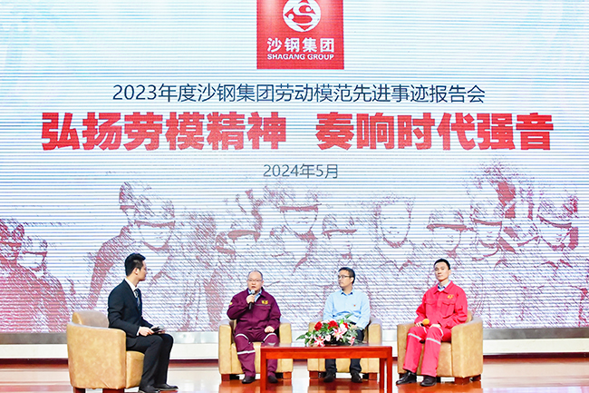 5月14日、15日,沙钢连续举办两场“弘扬劳模精神·奏响时代强音”2023年度集团劳动模范先进事迹报告会,这拉开了2024年劳模精神系列宣传教育活动的序幕,以此来表达对劳动模范的崇高礼赞,感染和激励广大职工干部立足岗位、奋勇向前。图为沙钢老、中、青3代劳模代表通过访谈的形式,分享他们自己的奋斗经历和对劳模精神的感悟。(张龙飞/文 孙静波/摄)