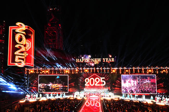 2024年12月31日,由北京市文化和旅游局主办的2025北京新年倒计时活动在首钢园四高炉举行(如图)。此次活动以“京彩之城共谱新篇”为主题,通过全园点亮、市内联动、京津冀三地联动的方式,全方位、多角度地展现北京城市形象,彰显京津冀区域协同发展的强劲动力与广阔前景。这是该活动第5次落地首钢园,作为举办新年倒计时活动最多的举办地,首钢园备受人们关注。2024年12月31日全天首钢园接待市民群众15.7万人次,比2023年12月31日10.9万人次增长44.0%,创2024年单日入园客流新纪录。当日23时40分,首钢园达到人流最高峰,在园人数为8.77万人次。(特约通讯员孙力摄)