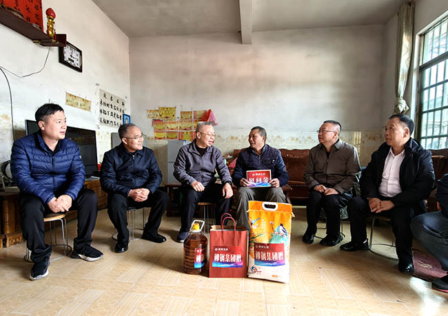 蛇年春节临近,1月14日,柳钢集团领导带着满满的暖意与祝福,前往柳钢定点帮扶的广西壮族自治区河池市罗城仫佬族自治县乔善乡古城村和宝坛乡五地村开展走访慰问,并召开柳钢集团2025年乡村振兴工作现场办公会,为全面推进乡村振兴战略、建设新时代中国特色社会主义壮美广西贡献柳钢力量。图为慰问组一行到脱贫户家中走访。(韦鹏/文 利国胜/摄)
